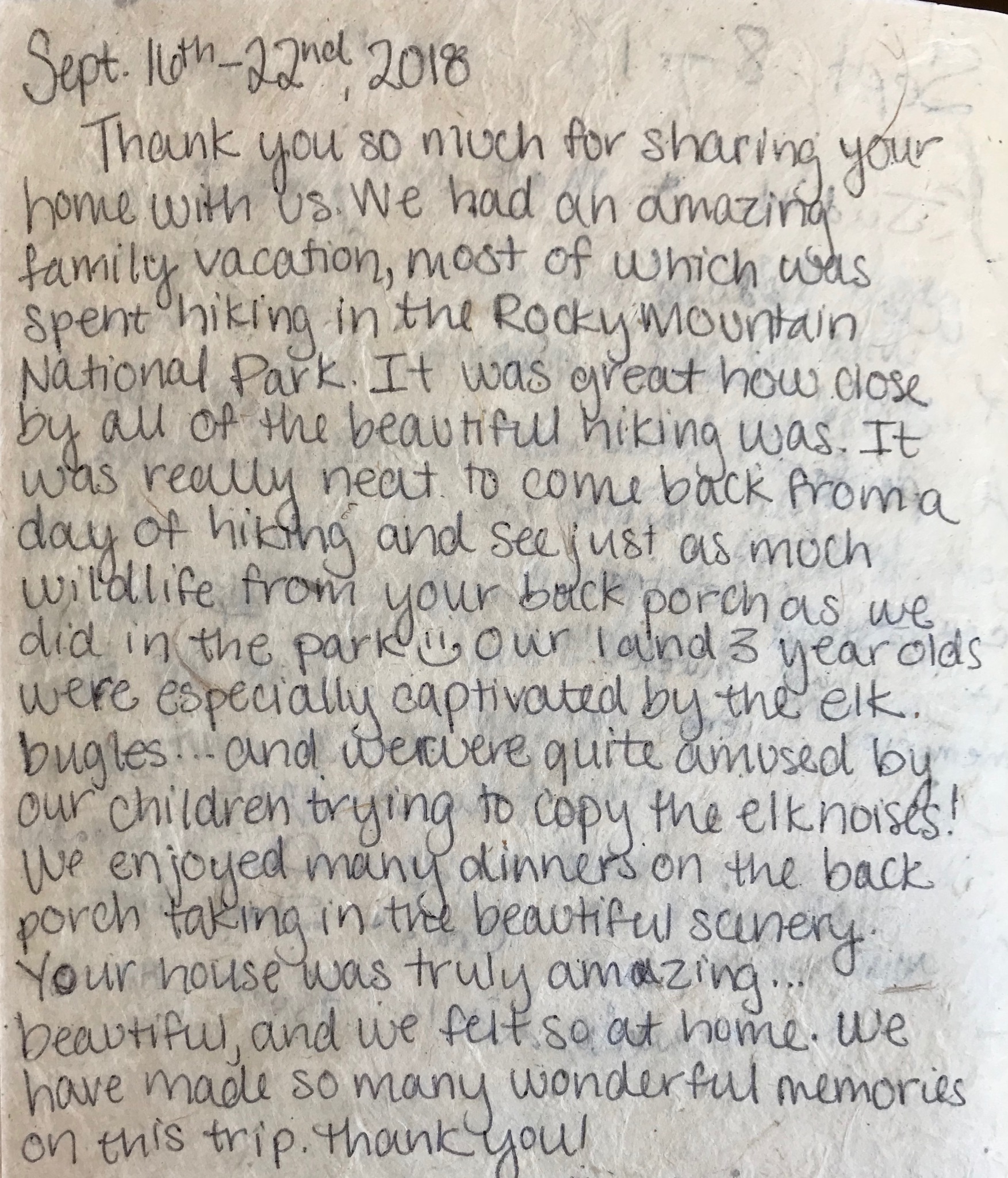 “Thank you so much for sharing your home with us. We had an amazing family vacation, most of which was spent hiking in the Rocky Mountain National Park. It was great how close by all the beautiful hiking was.”
