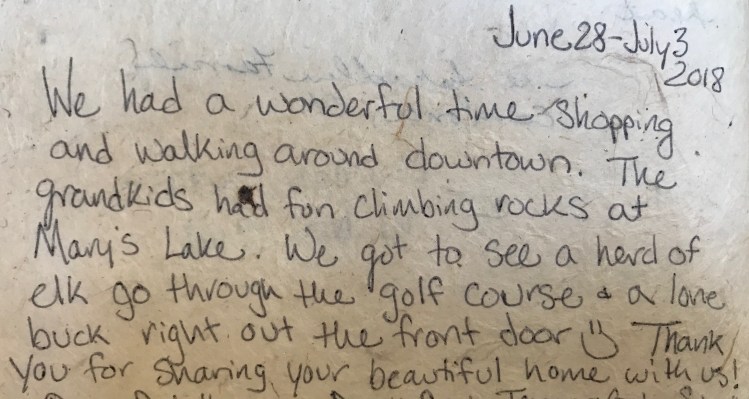 “We had a wonderful time shopping and walking around downtown. The grandkids had fun climbing rocks at Mary’s Lake. We got to see a herd of elk go through the golf course & a lone buck right our the front door. Thank you for sharing your beautiful home with us!”